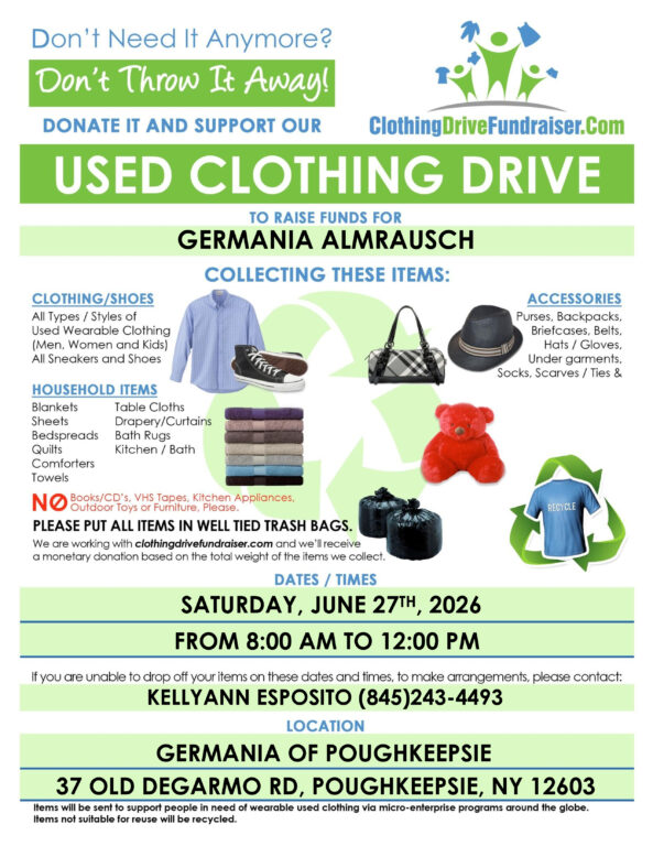 Don’t need it anymore? Donate it to the Germania Used Clothing Drive. The drive focuses on collecting gently used clothing and other items to support the community. Organizers encourage donors to collect items now in preparation for the single-day drop-off in June. For specific questions regarding acceptable items or early drop-off possibilities, you can contact Germania Almrausch S.V. at (845) 471-0609 or via email at almrauschsecretary@germaniapok.