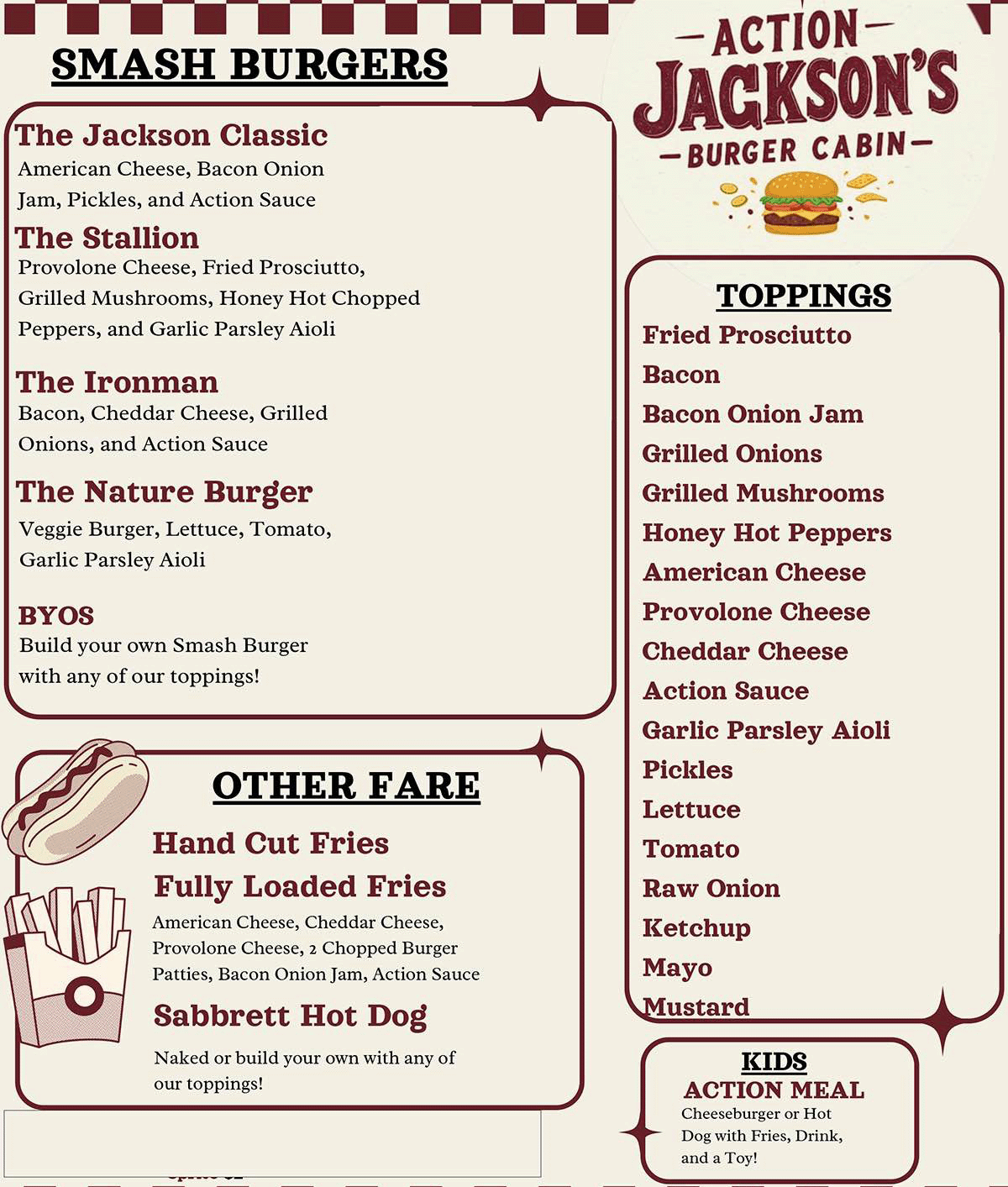 Action Jackson’s Burger Cabin is a popular, family-owned food truck specializing in delicious smash burgers. Located in Florida, New York, the truck mainly operates out of the Glenmere Brewing Company in Florida, New York. It offers a diverse menu featuring juicy smash burgers, generous loaded fries, and classic hot dogs. Renowned for its friendly, welcoming service, Action Jackson’s Burger Cabin has built a reputation for serving flavorful food that keeps customers coming back for more.